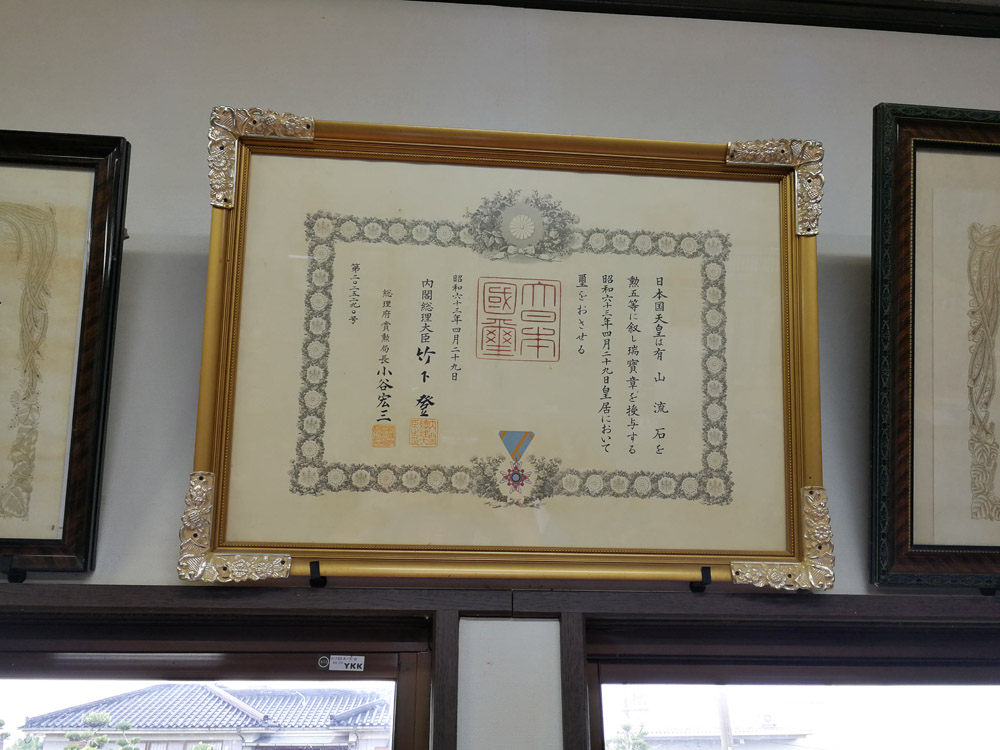 除黑薩摩傳統的酒器、茶器等作品外,長太郎燒也有現代情趣的日用陶瓷、食器。尤其是還有不少創作性、實驗性的純藝術陶瓷作品,且屢獲大獎。牆頭上一排獎狀證書中,最中央醒目處,便是這幅有“日本國璽”印章的獎勵狀:昭和六十三(1988)年,由天皇授予先代長太郎有山流石先生勳章(勳五等瑞寶章),且有內閣總理大臣竹下登的簽章。